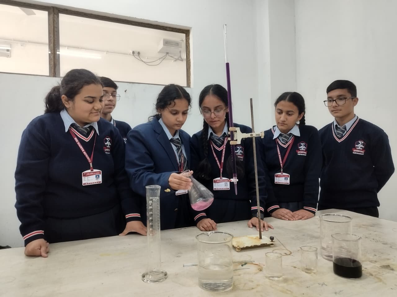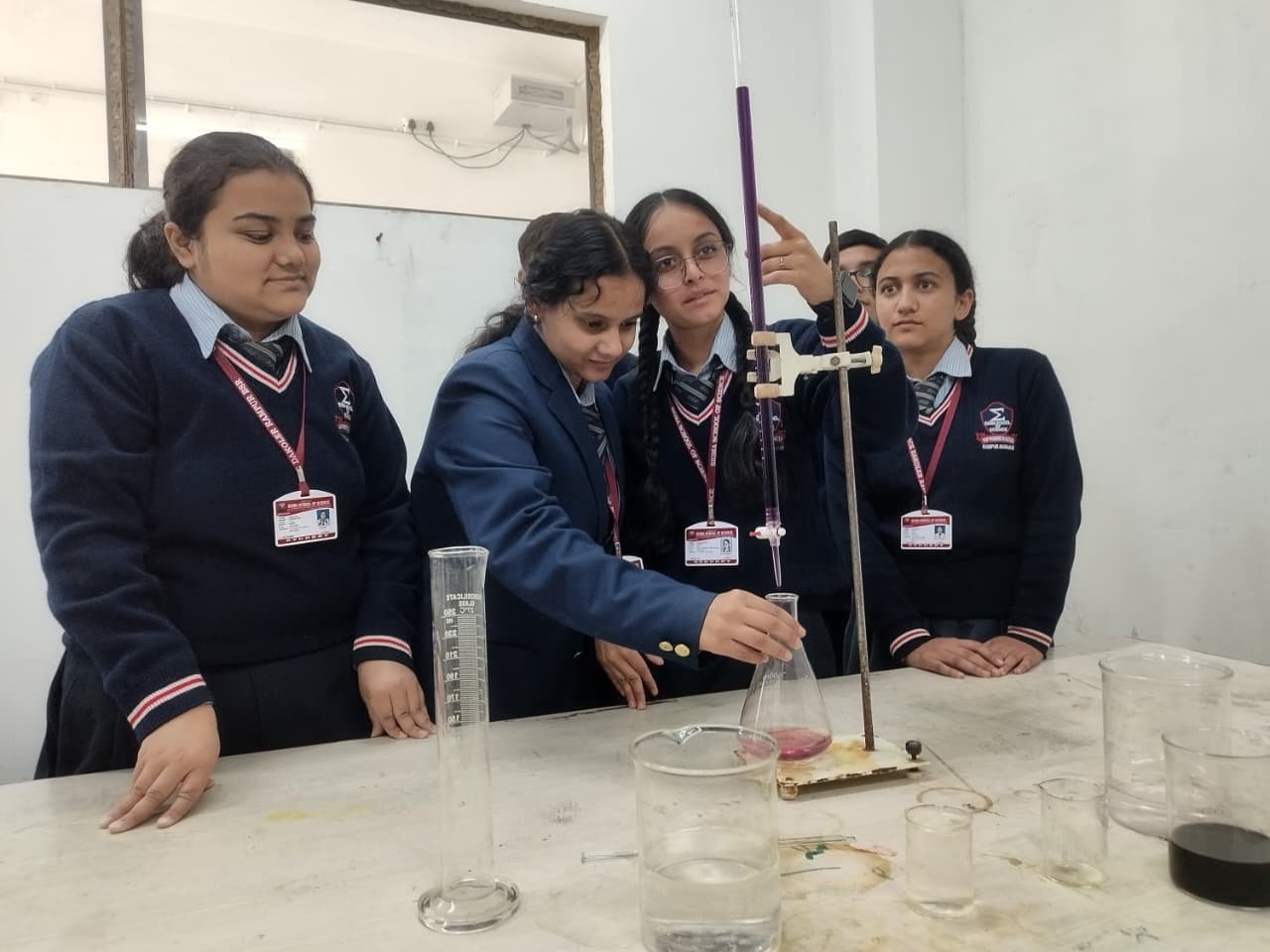 Chemistry Lab: Equipped with essential glassware, reagents, and safety tools, students conduct experiments in chemical reactions, acids and bases, and salt analysis.